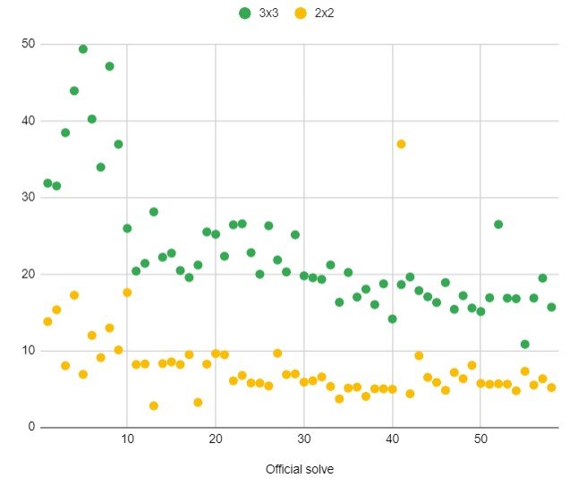 The mean tells us that for 3x3, the average of all of my times is 22.9 seconds. This makes sense as chronologically, I started off being able to solve a cube in 30-40 seconds, and can now solve one in roughly 15 seconds. Near the chronological middle between then and now, I was able to solve 3x3 cubes for over 20 seconds. The median for 3x3 is 20.9 seconds, which relatively speaking, is a very similar value to the mean. Both the mean and median for 3x3 show the gradual improvement of my times across official solves.