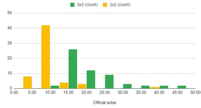 The box and whisker plots below clearly demonstrate the magnitude of the outlier values, especially for 2x2 where the box is miniscule, and one of the whiskers stretches really far. In both cases, there seems to be a positive skew, where there are much more lower values than there are higher values.
