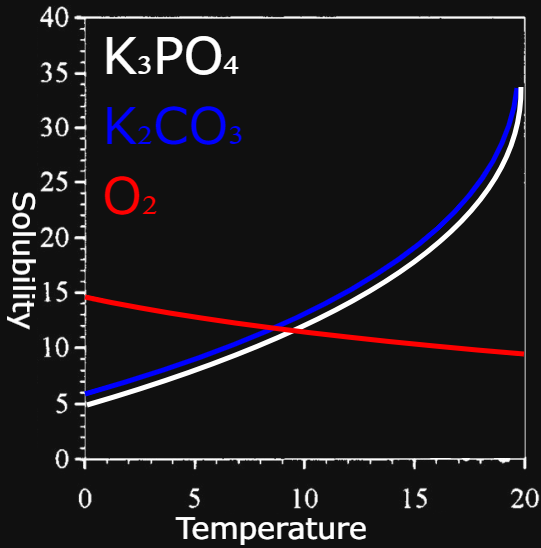 The solubility curve of K₃PO₄ compared to K₂CO₃ and O₂: